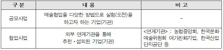 ※ 협업사업 중 농협중앙회 연계 협업사업은 “퍼실리테이터 예술인” 없이 진행되니 참고하시기 바랍니다.