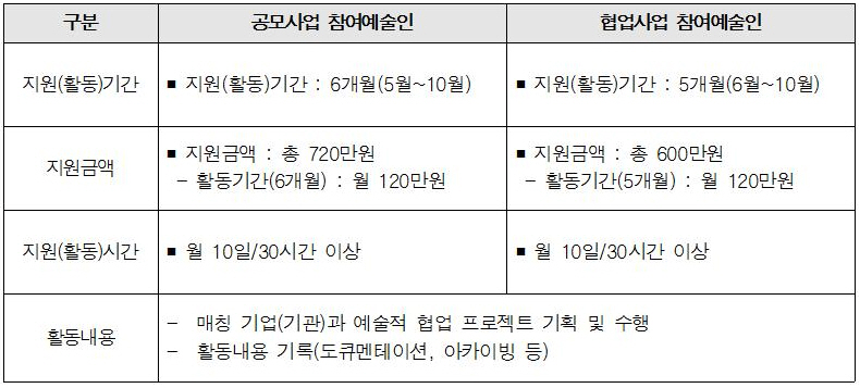 ※ 활동비는 참여예술인 선정 이후, 기업(기관)과 매칭이 완료되어 <월별 활동보고서> 제출을 완료한