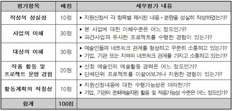 ○ 『예술인 파견지원』사업은 신청 예술인의 사업이해도, 문제해결능력 등을 종합적으로 심의하여 선정된