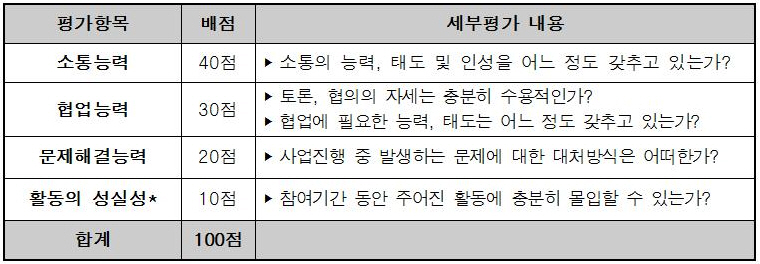 - (2차) 면접심의 : 1차 서류심의를 통과한 신청인을 대상으로, 소통 및 문제해결능력, 기획 및 성과관리
