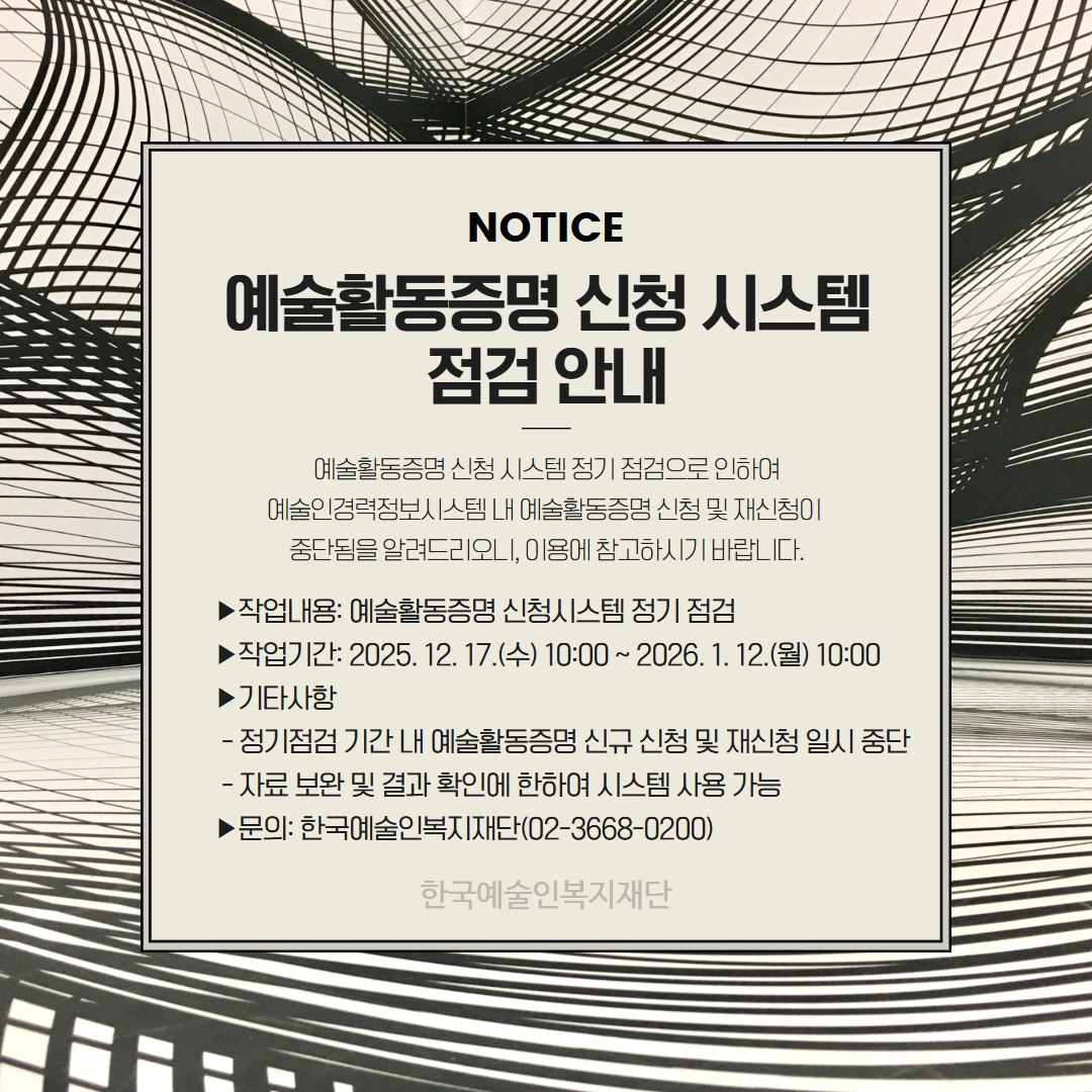 - [안내] 예술활동증명 신청 시스템 정기 점검 안내(2025. 12. 17. ~ 2026. 1. 12.) 25.11.26 +