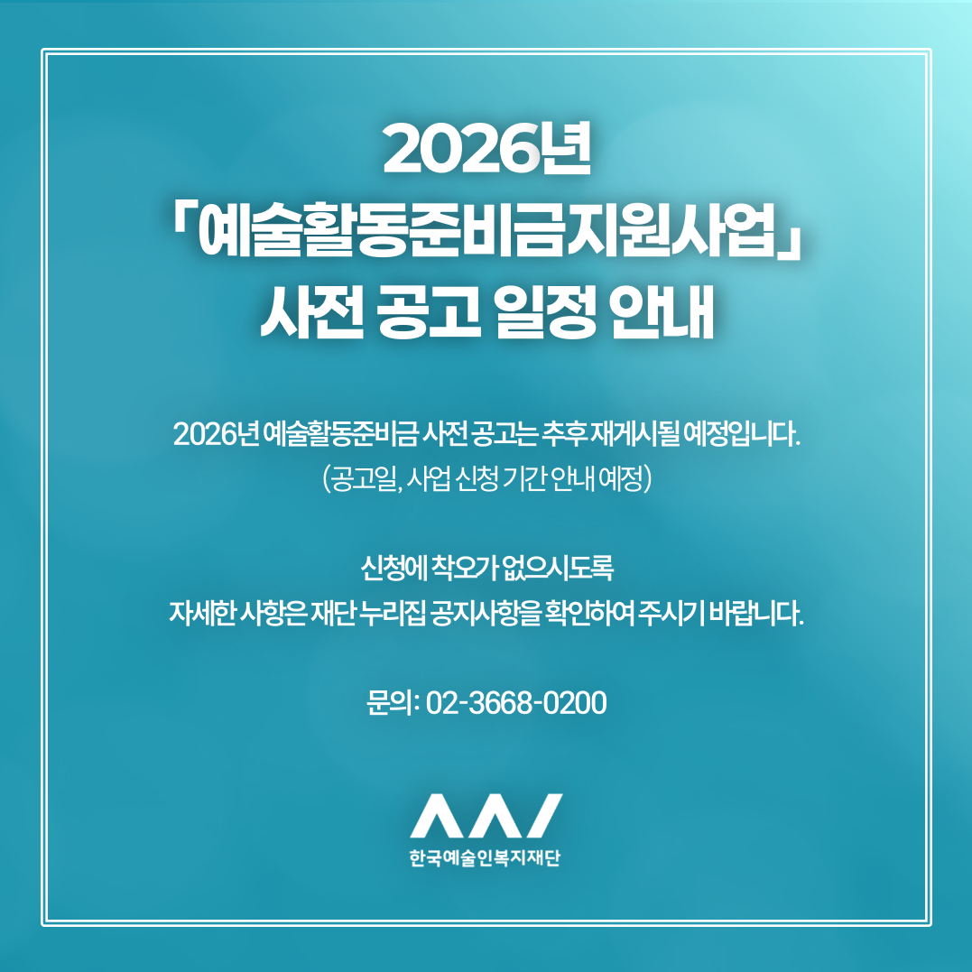 - 공지 [안내] 2026년 「예술활동준비금지원사업」사전 공고 일정 안내 26.02.04 +