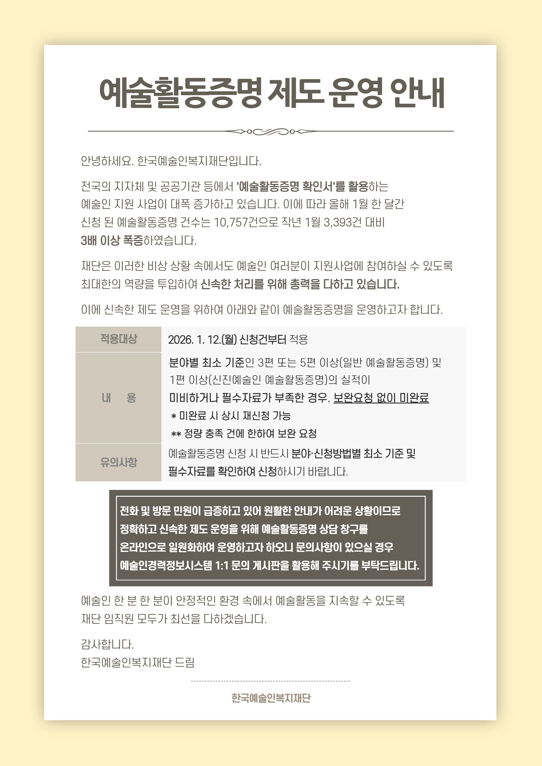 한국예술인복지재단 뉴스를 확인하세요!- [안내] 2026년 「예술활동준비금지원사업」사전 공고 일정 안내 26.02.04 +