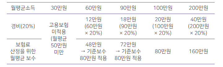 – 월평균소득이 200만원이면 경비 40만원(200만원 × 20%)을 공제하고 160만원이 됩니다. 이 경우 보험료를 산정하는 월평균보수는 160만원이 됩니다.
